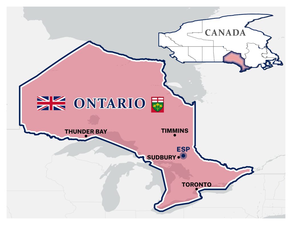 ESP spans 19,710 hectares east of the prolific Sudbury mining camp in Ontario, Canada. This area benefits from extensive mining infrastructure, an abundance of qualified and experienced mineral industry professionals and several centers of mining and mineral processing excellence (Figure #1).
