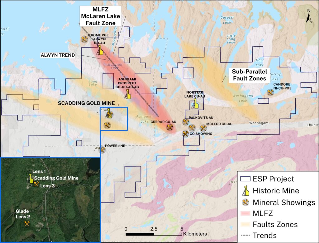 The ESP encompasses several areas of gold, copper and critical mineral mineralization which are today interpreted to be related to a mineral system that has formed IOCG and affiliated critical and precious mineral deposits. Included within the Project is the historical Scadding Gold Mine and associated gold mineralized system and the gold bearing tailings (Figure #3).
